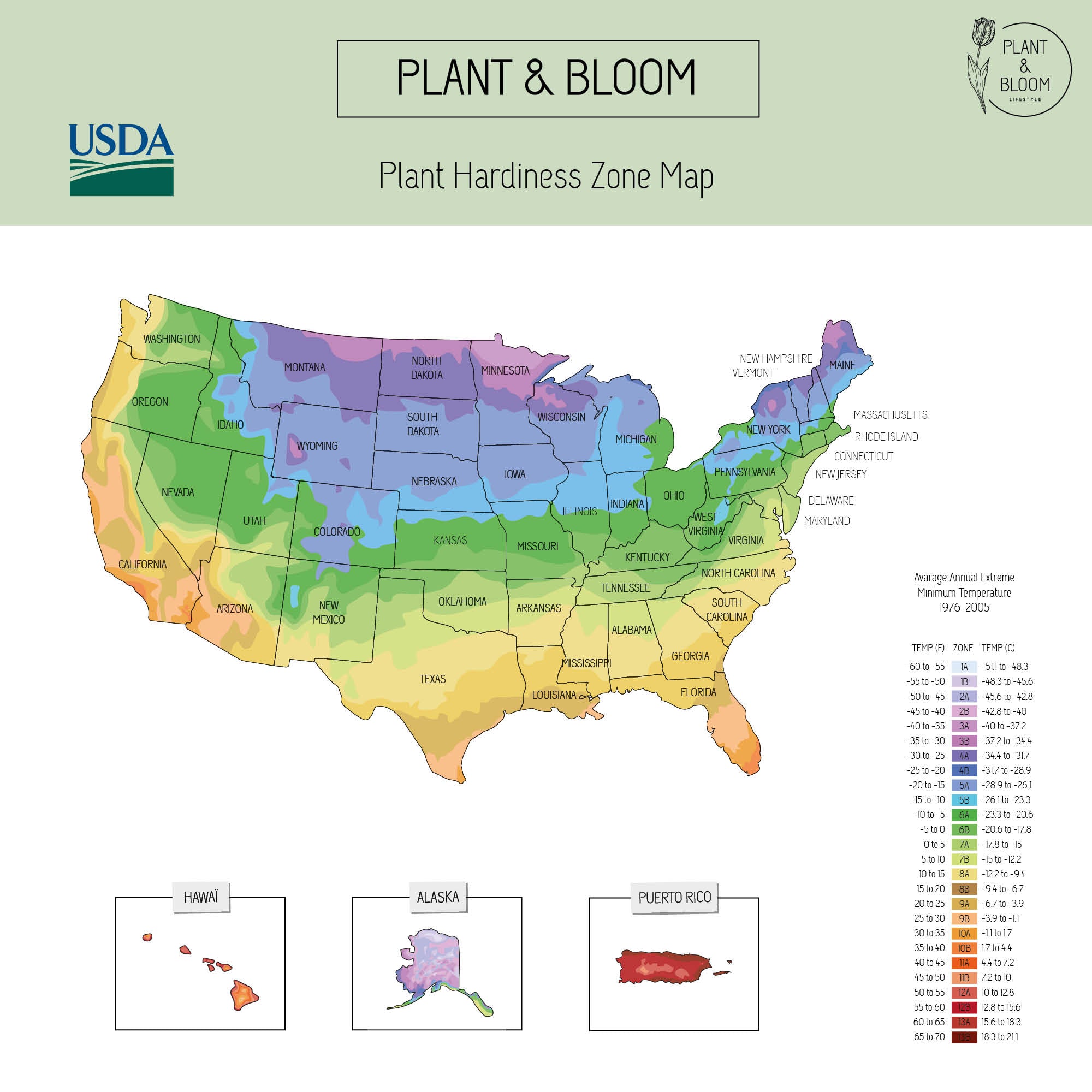 Below you can find our hardiness zone. Ranging from 1 to 13, a hardiness zone is the range of possible temperatures and conditions in a specific geographical area. Every plant has a zone where it can be happy outdoors all year long. The majority of the Plant and Bloom catalogue will thrive in zones 8-11. Don’t fret if you live in zones that can get colder or hotter than this range, you can move your plant indoors during the most extreme parts of the season and get some extra green in your home.
