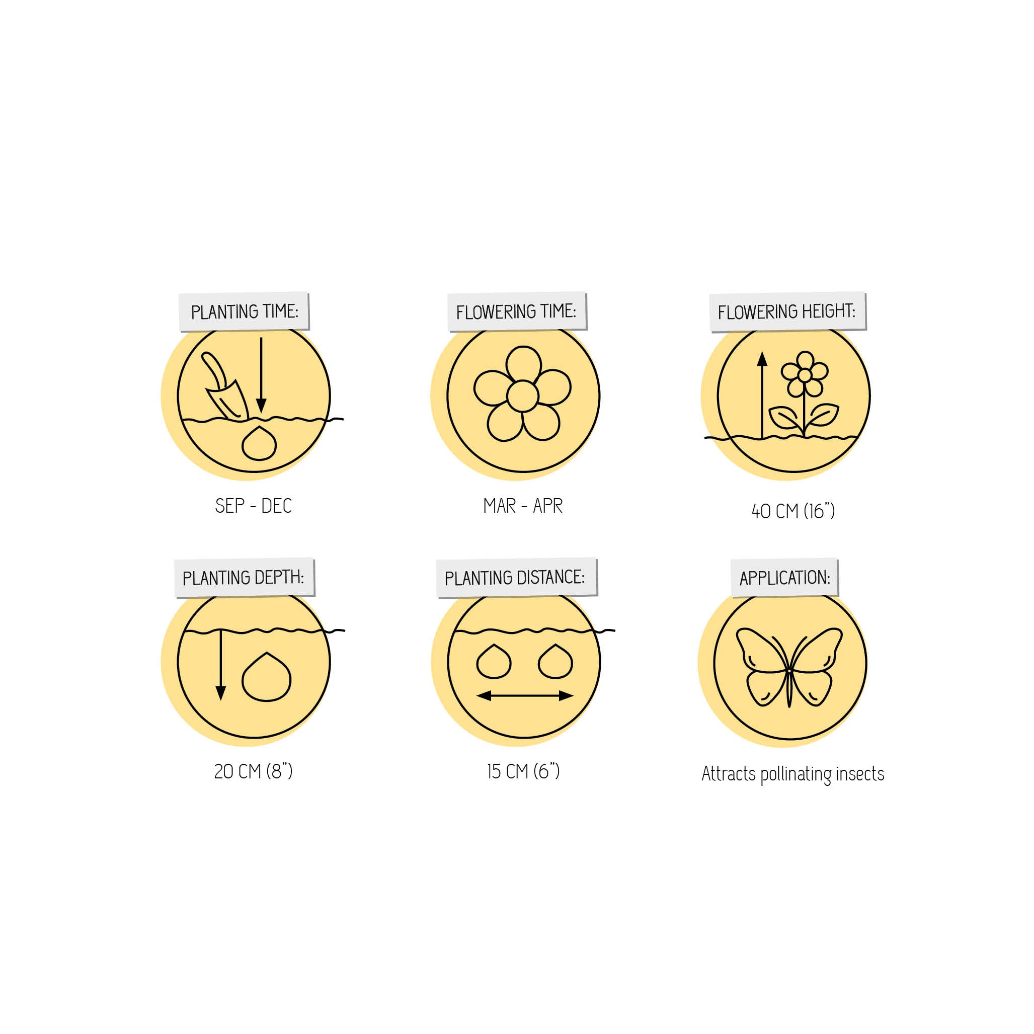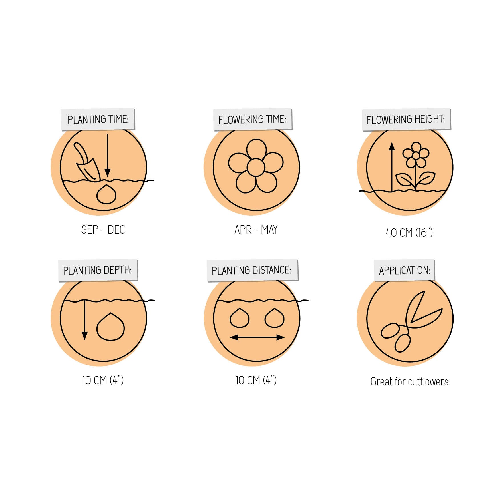 Most spring-flowering Dutch flower bulbs thrive in full or partial sun and locations that offer good drainage. Flower bulbs will rot in standing water, so avoid areas prone to flooding such as the bottom of slopes or under drainage pipes.*Below steps are applicable for our entire spring-flowering collection.